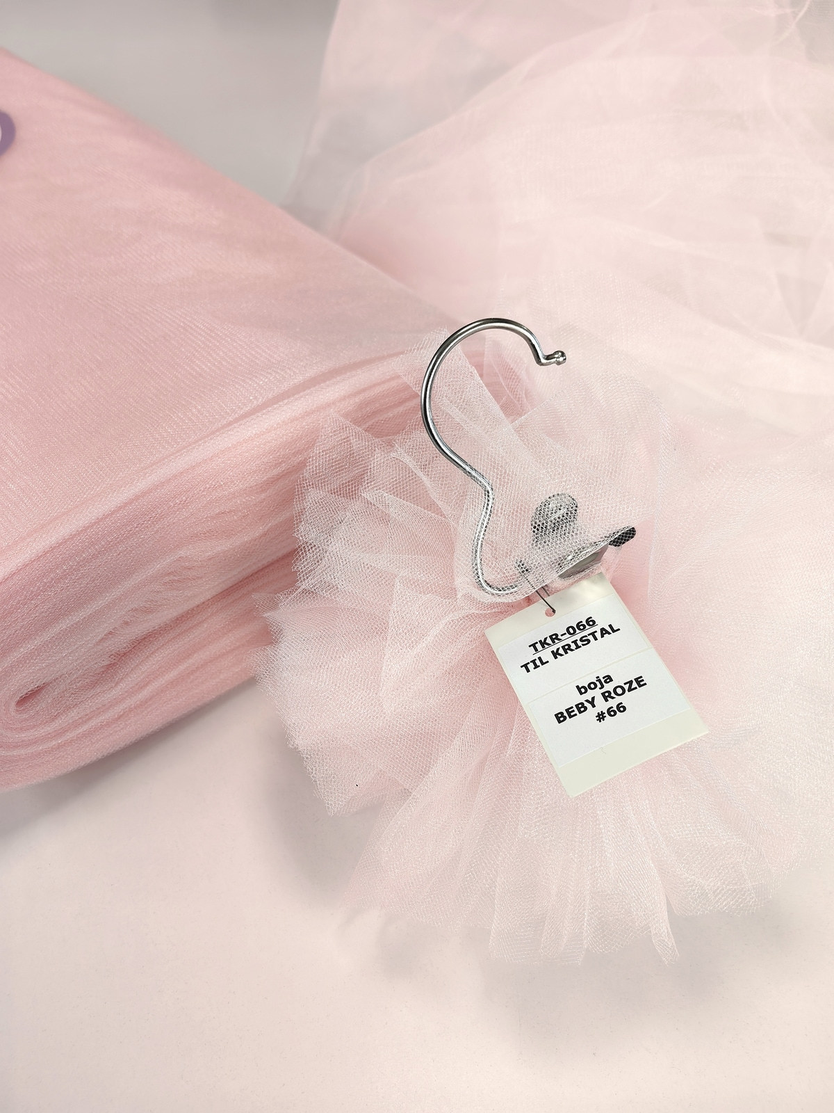 Til Kristal boja Beby Roze upadljiv, privlačan, sa primetnim kristalnim sjajem. Savršeno drži oblik, nje skup. Najviše se koristi za dekor venčanja, proslava i automobila, za kostime, maskenbal, baletske pačke. Takođe se koristi za donje suknje ispod teških tkanina.